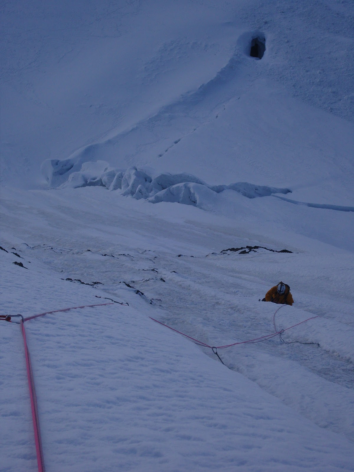 That night, sandwiched between two men in 2-person tent with my pulse pounding in my temples, I had my first taste of Cheyne-Stokes breathing, a horrible condition which soon had me afraid of falling asleep so I wouldn’t wake up in a gasping panic. At one am the alarm rousted us to don our boots and follow yesterday’s tracks, and at daybreak we started ascending an icy groove up the headwall, finding little use for our snow pickets as the face was mostly ice. Unfortunately, the weather deteriorated quickly and when snow started sluffing down continuously onto our shoulders we reached a unanimous decision to cut v-threads and rap to the safety of the glacier below.